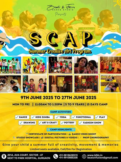We run a 15-day holiday camp for kids aged 5 to 9 with daily dance, Zumba, yoga, art, and pottery, plus a studio showcase, professional dance video, and certificate for every child.