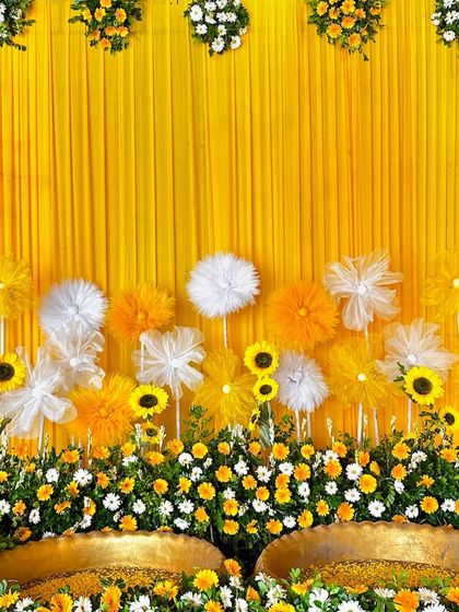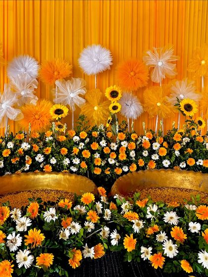 We specialize in creating unique and vibrant haldi ceremony setups that break from tradition. Our signature style includes non-traditional color schemes, like pink instead of conventional yellow, combined with elaborate floral arrangements and themed elements like carnival-inspired decor.