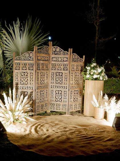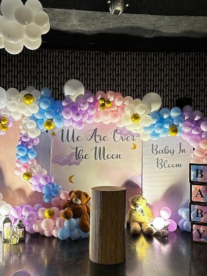 Anniversaries get either full-on rustic farmhouse feels - pampas grass, crates, macrame - or dramatic luxe setups with green backdrops and statement lighting. Baby showers? I’m all for sweet pastel baby shower setup, moon props, and fun name reveals with light-up letters. Even traditional ceremonies like mundan get a playful twist.