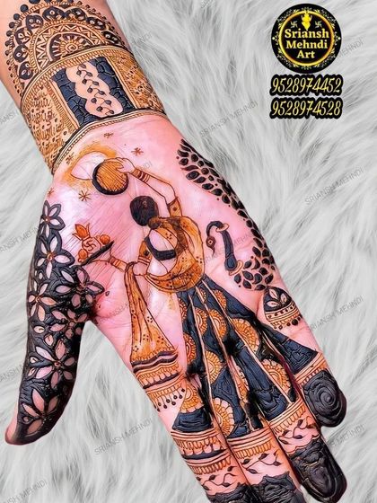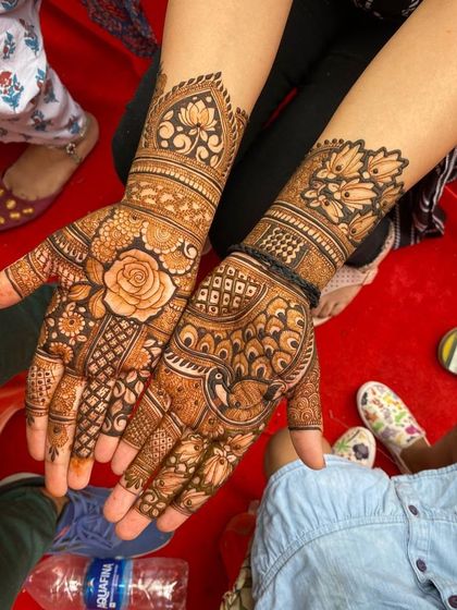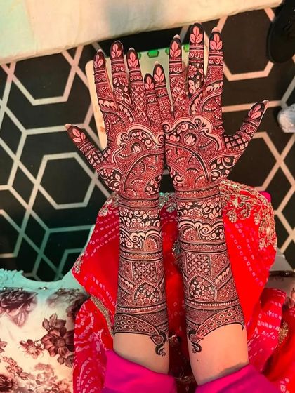 Prices vary by unit: per hand, per bride, or per event. Vijay Singh is ₹250–₹1500 per hand with a free home trial. Sriansh Mehndi Art is ₹6500 per person for both hands up to elbows. Hajira Mehendi Artist offers bridal packages around ₹7500. Queen of Angel lists per event at ~₹6500. Mytribe clarifies inclusions—front/back, feet, team size, organic cones—before you confirm.