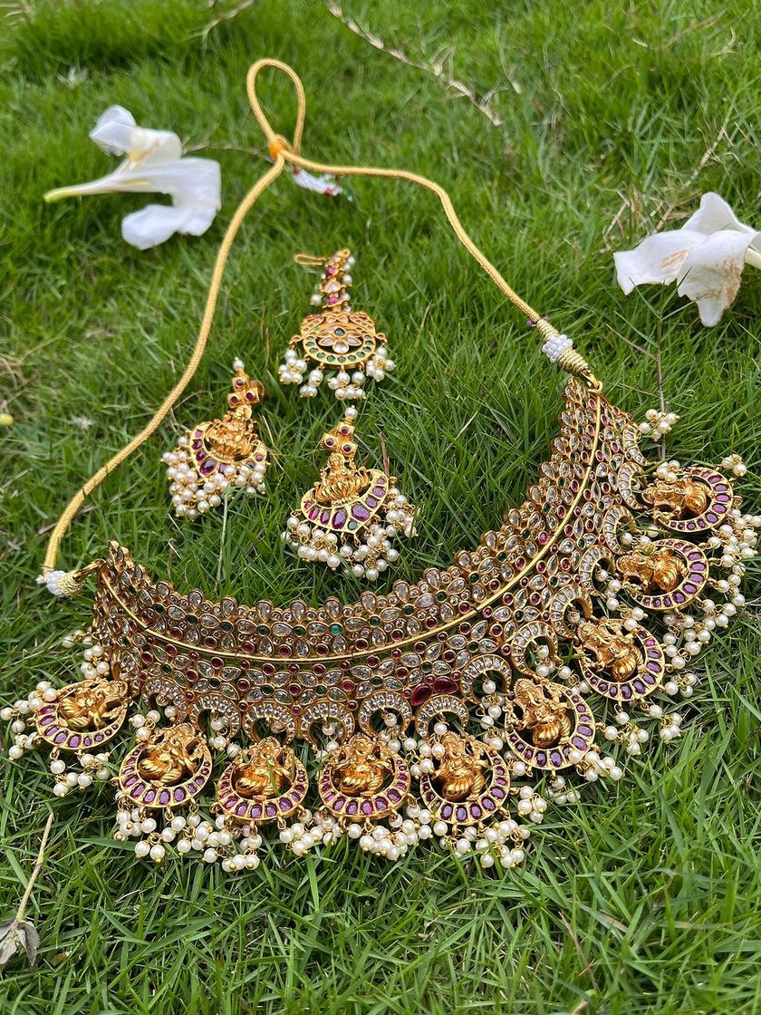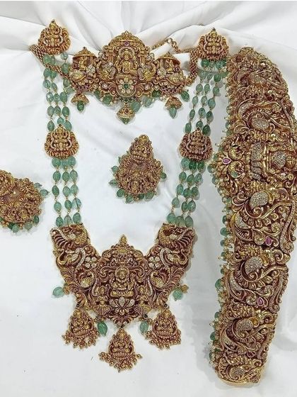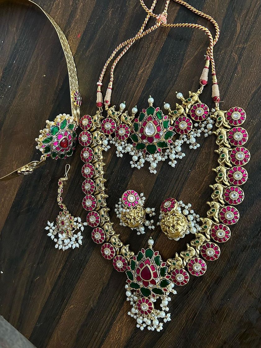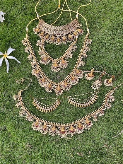 I offer complete, coordinated jewellery sets for rent to make your selection easier. These sets typically include everything you need, from a choker and long necklace to a waist belt, earrings, and maang tikka.