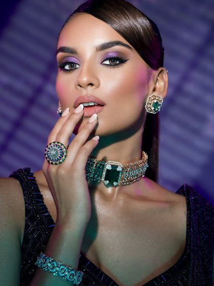 - Macro-style capture of craftsmanship, cuts, and stone clarity on a model.