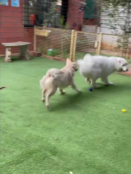 See our doggos in action in our large, fully-fenced outdoor dog playground. I ensure all play is supervised, allowing your dog to socialize, exercise, and burn off energy safely with their new friends, whether they are chasing balls, playing tag, or just exploring together.