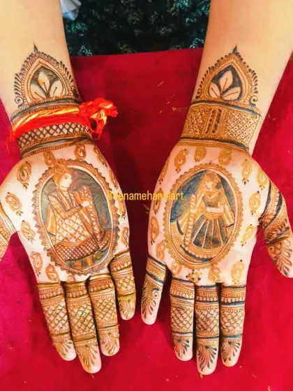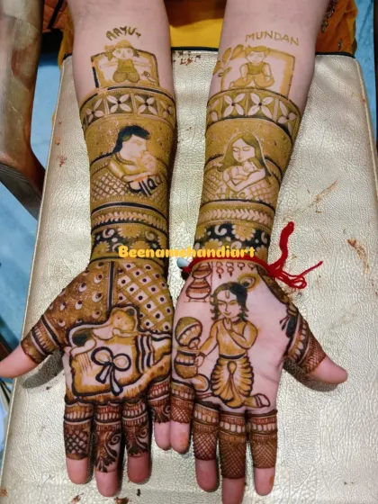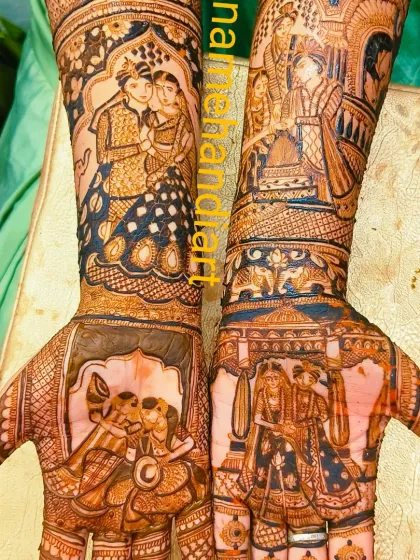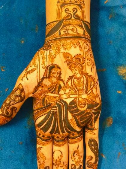 Portrait Mehandi Specialist - Portrait mehandi art – bride-groom, Radha Krishna, cartoon figures for Rakhi, detailed stories in design.