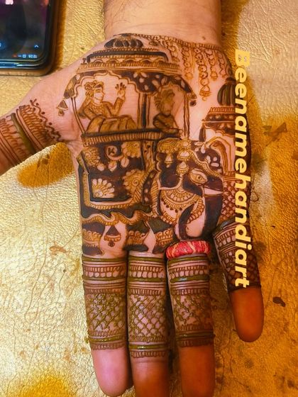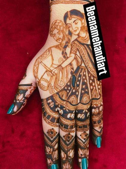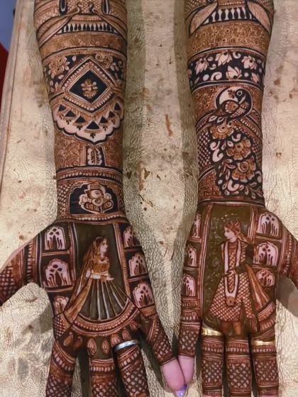 I create detailed bridal mehandi with custom portraits, personal motifs, and full hand and feet coverage for brides, grooms, and guests.