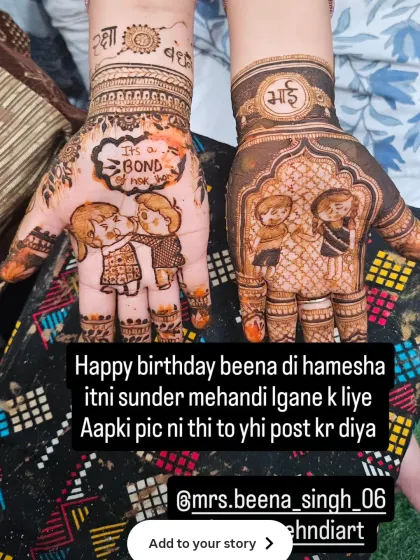 Hello ji! Main Beena, mehnat ki dukaan (hardworking person). Mehandi lagana mera sukoon hai – bina kaam ke toh mujhe chain hi nahi milta. Log bolte hain, 'Artist ho, aasaan hoga.' Par asli mehnat toh kamar dard, raat ki neend, aur dark circles mein hai. Success sirf talent nahi, parivaar aur bhagwan ka saath bhi chahiye. Bholenath, Ganpati Bappa, Jai Shree Shyam – sabki kripa hai.