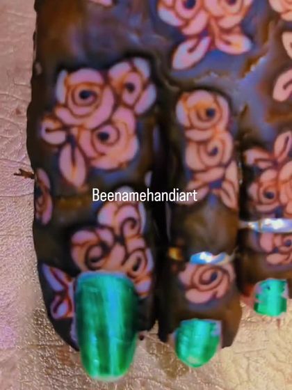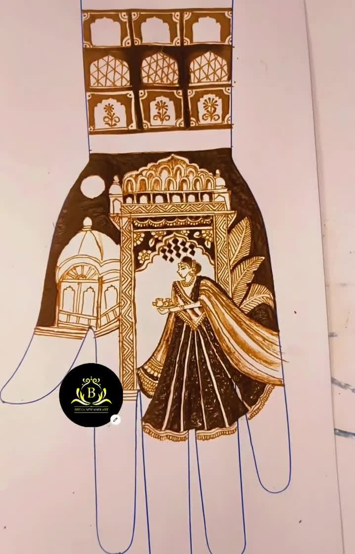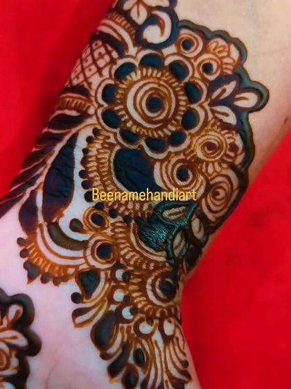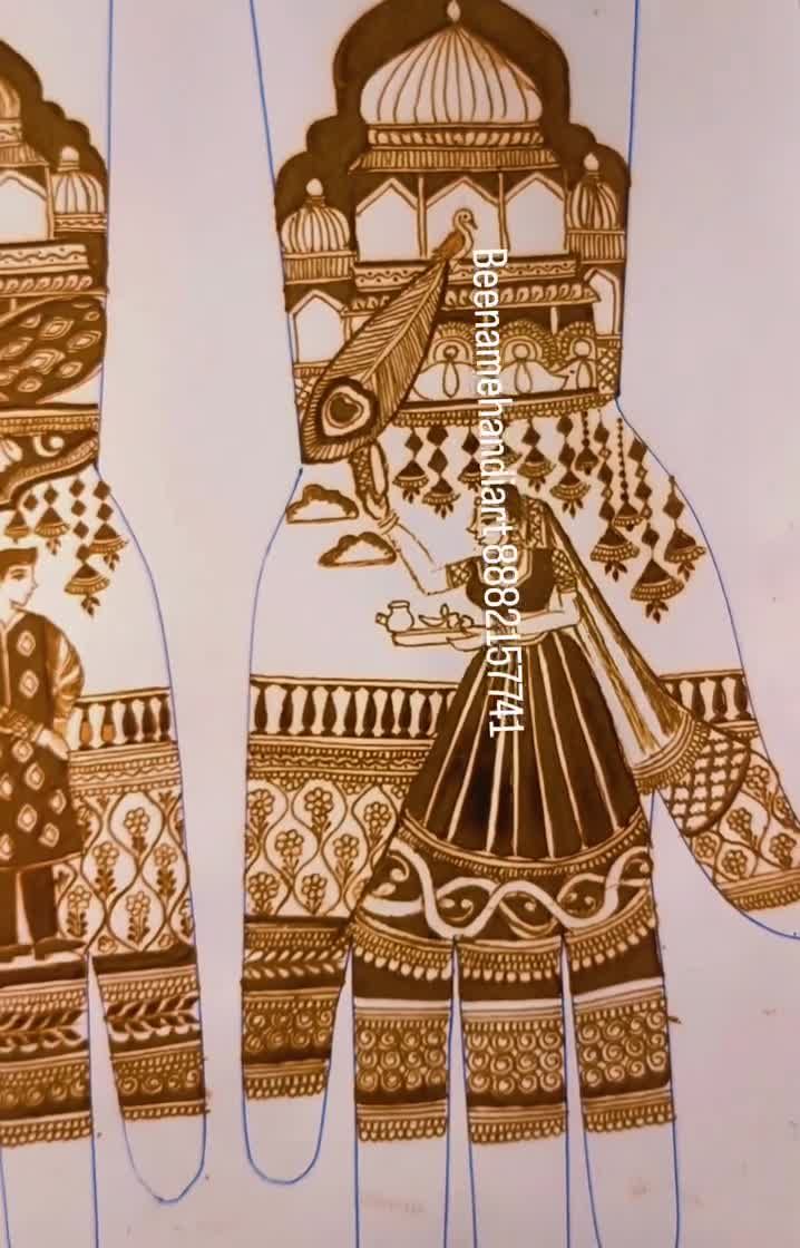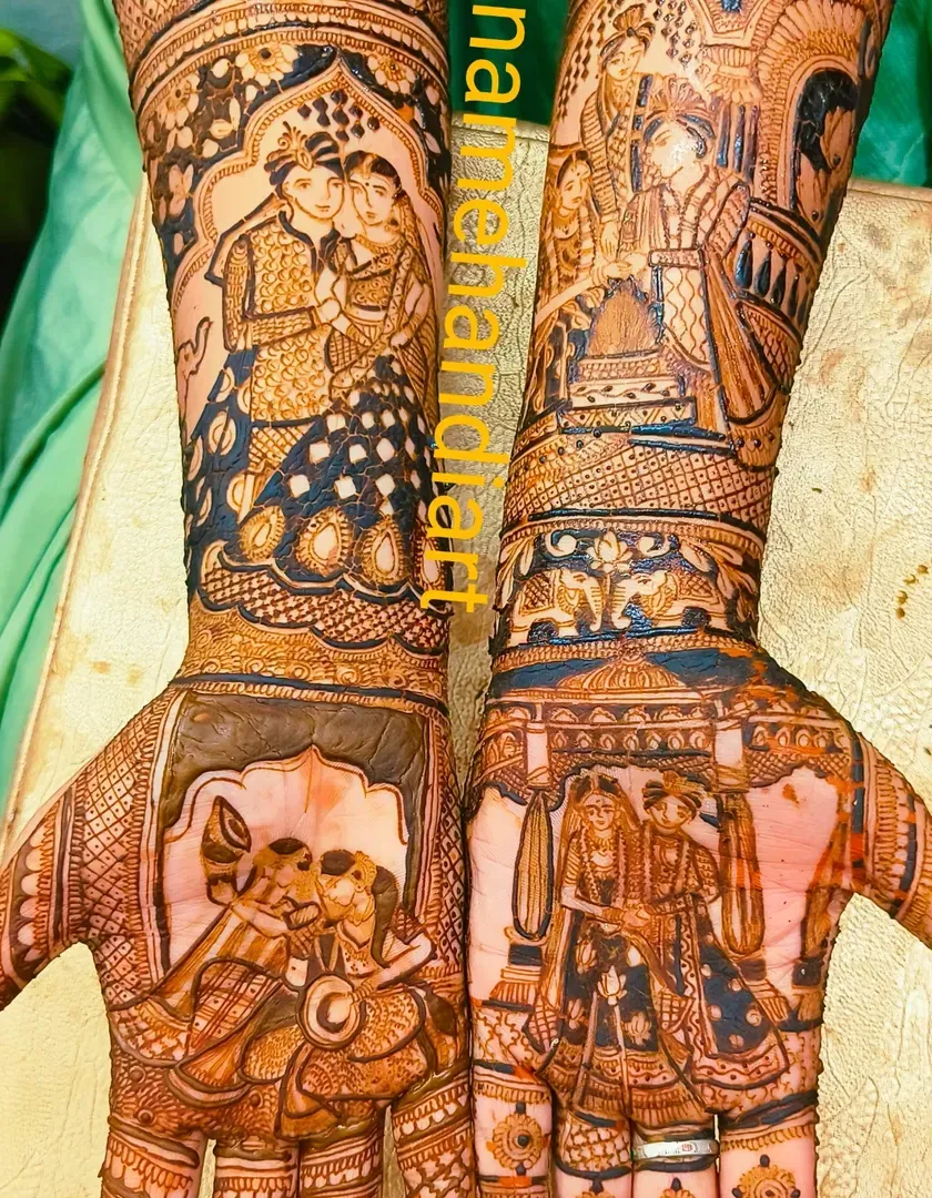 This is my specialty and what I love doing the most. I can create beautiful, detailed portraits of you and your partner, capturing moments like the varmala or doli, right on your hands. It's a unique way to make your bridal mehandi truly personal and a memory for a lifetime.
