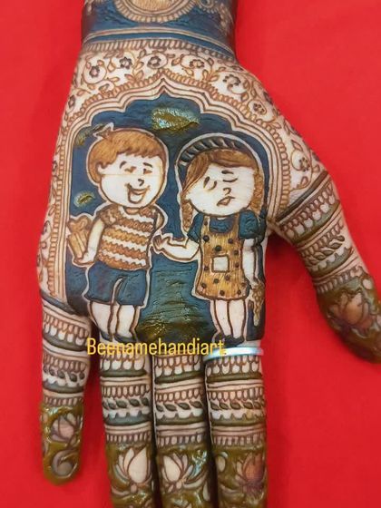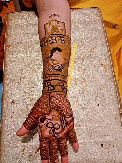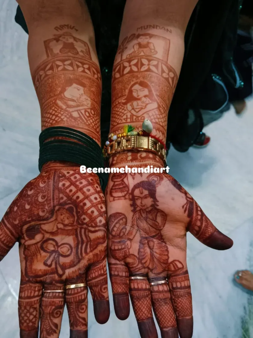 Celebrating the arrival of a new baby is a beautiful occasion, and I love making special mehandi for it. I create custom designs with portraits of the parents, baby figures, and elements from the mundan ceremony to make it memorable.