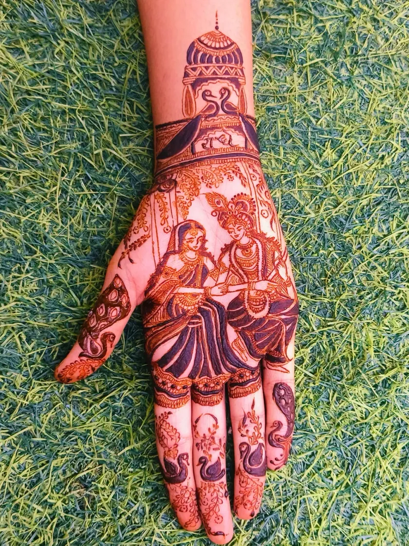 Karva Chauth and Teej are festivals very close to my heart, and I love creating special story-telling mehandi for them. I can make detailed portraits of a wife with a chhalni, couples together, or women on a jhula, all surrounded by traditional patterns.