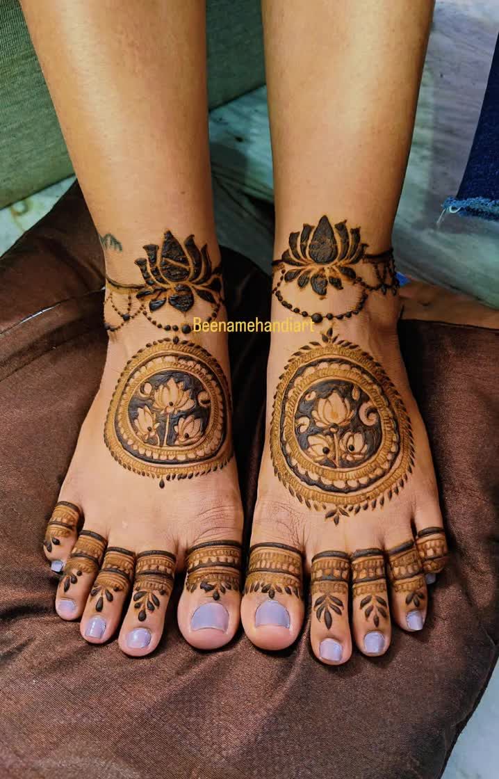 Don't forget your feet. I create beautiful mehandi designs for feet, from simple and elegant patterns to full bridal coverage that matches your hands. Whether you like floral designs, mandalas, or traditional motifs, I can make your feet look just as special.
