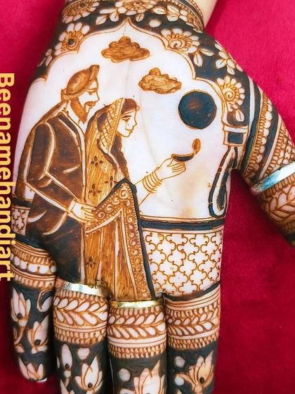 We specialize in creating distinctive mehndi designs for grooms, focusing on masculine and traditional motifs. Our designs incorporate geometric patterns and cultural symbols, with a playful touch of hiding the bride's name within the artwork.