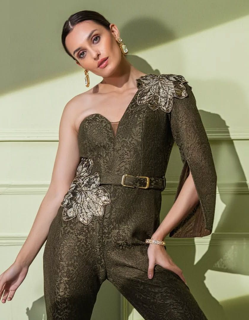If you’re after something less typical, my Indo-Western collection blends Western shapes with Indian craftsmanship. Here you’ll find chic jumpsuits with ethnic embroidery, modern dhoti sets paired with corsets, and other layered ensembles. These outfits are perfect for a cocktail party, sangeet, or any event where you want to make a unique style statement.