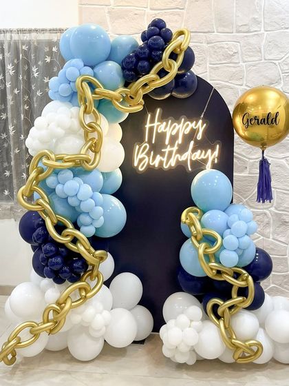 - Elegant luxury balloon decor for milestone parties with custom neon signs or golden bursts
