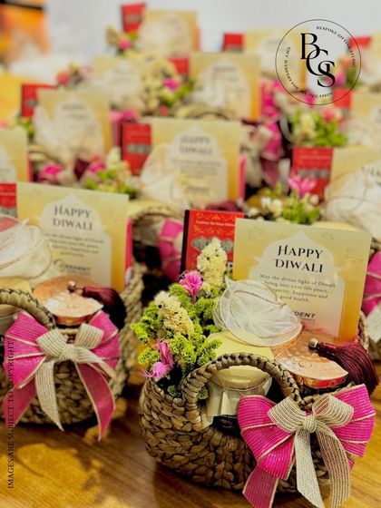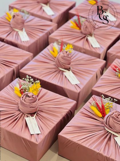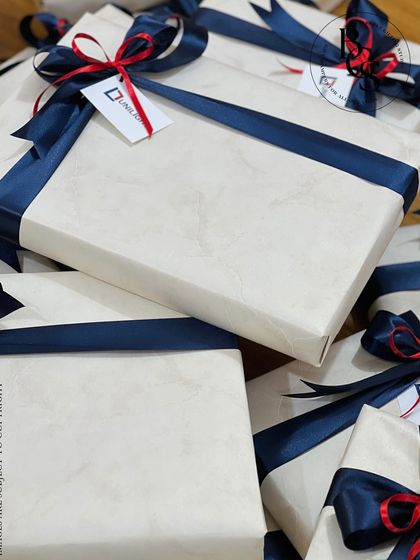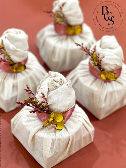 We wrap bulk gifts for events and corporates at our Andheri West studio using fabric, luxury paper, and custom details like bows and tags.