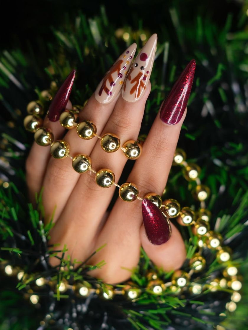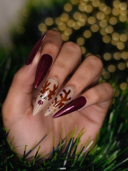 I offer a range of hand-painted designs to celebrate the holiday season. This gallery features different festive sets, including playful reindeer on nude polish, elegant mistletoe on deep green, and classic red with detailed snowflakes.