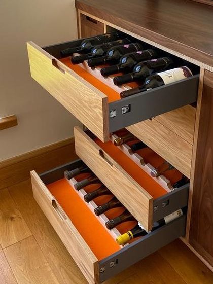 This gallery provides a complete overview of a custom-built drinks cabinet project, from the overall design to the specific functional details. The unit features a mix of solid walnut and oak, integrated LED lighting, and specialized storage for wine, spirits, and glassware.