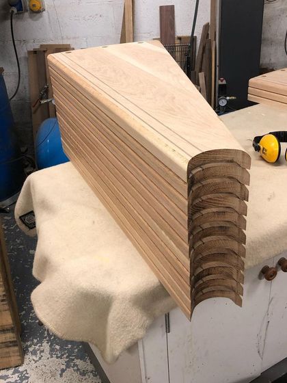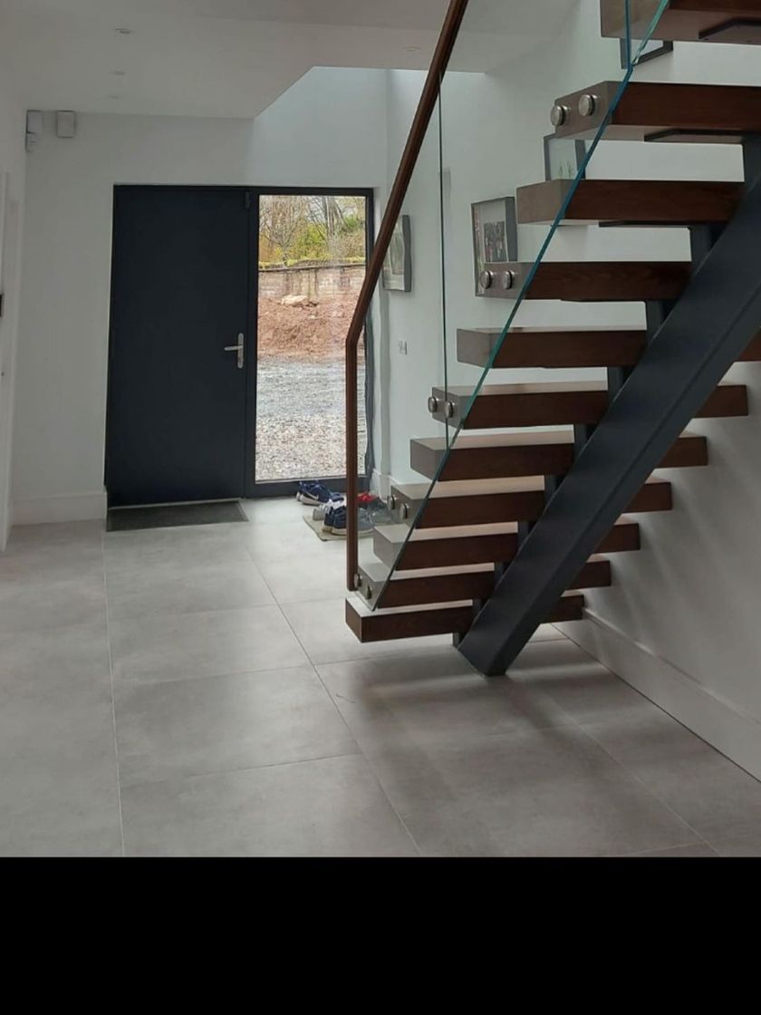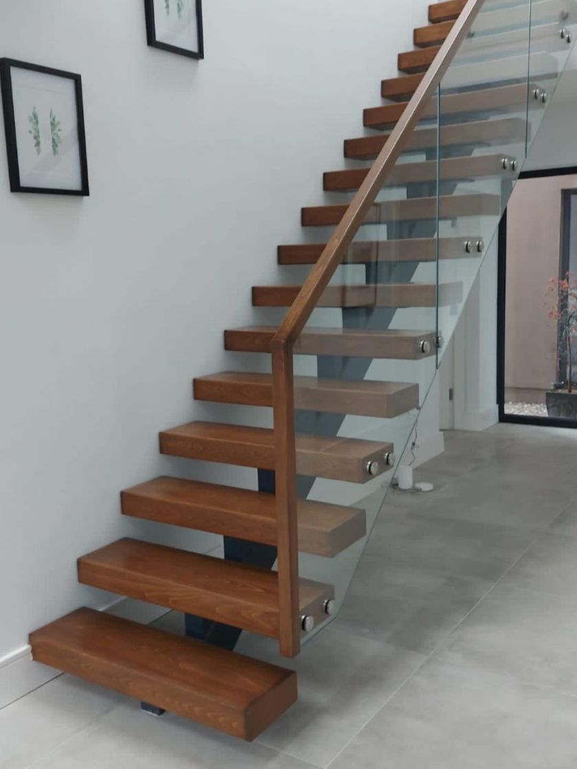 These staircases create a modern, floating effect with a single steel beam for support. I design them to maximize light and space, using solid oak treads and toughened glass balustrades for a clean, open feel.