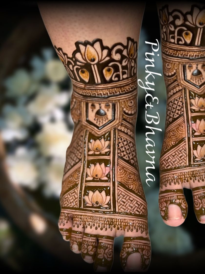 A bride's journey begins with her feet, and I make sure they are just as beautifully decorated as her hands. I create intricate and complementary designs for the feet, ensuring your complete bridal look is perfect from head to toe.