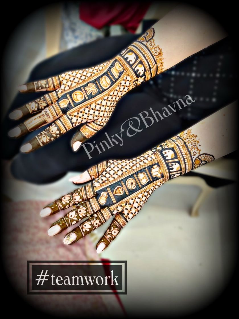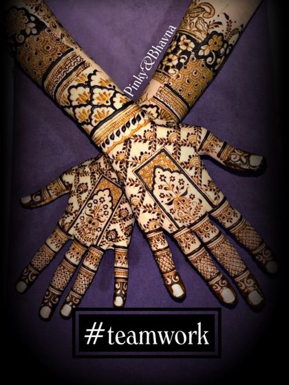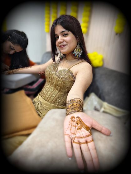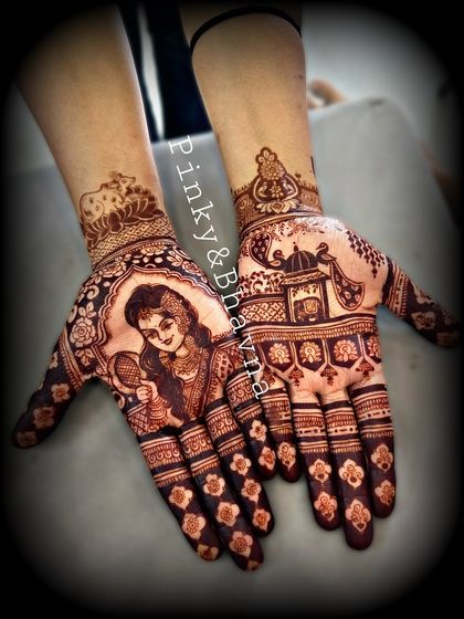 Our specialty is creating full bridal mehndi that tells a unique story. This gallery showcases our most detailed work for brides, including full arm and leg designs with personalized elements, portraits, and traditional motifs.