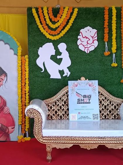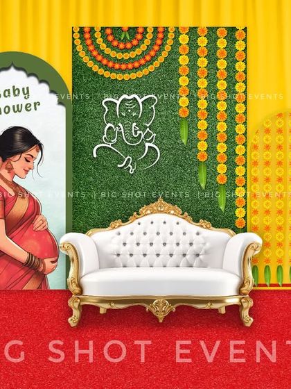 - Traditional baby shower backdrop setups with ornate sofas and symbolic elements like Ganesha cutouts, all about celebrating the mom-to-be.