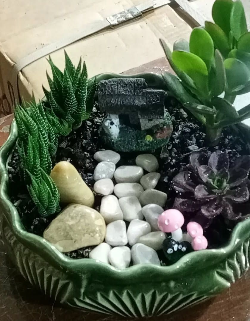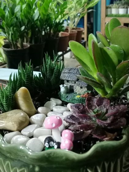 Perfect for desks, shelves, or as a unique green gift. I create custom miniature tray gardens featuring succulents, decorative pebbles, and tiny figurines to bring a small world of nature into your space.