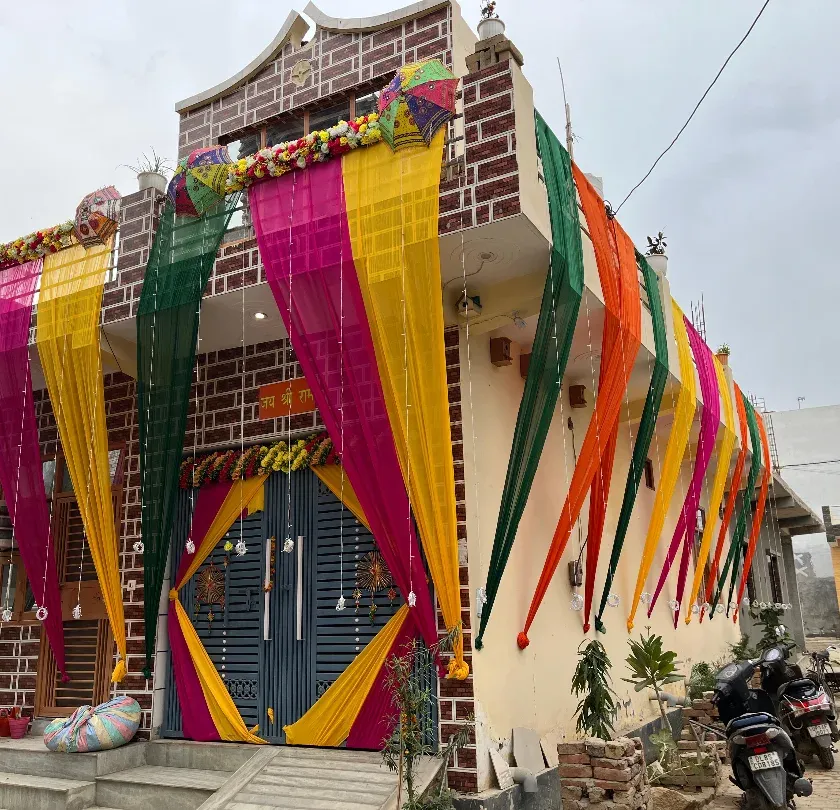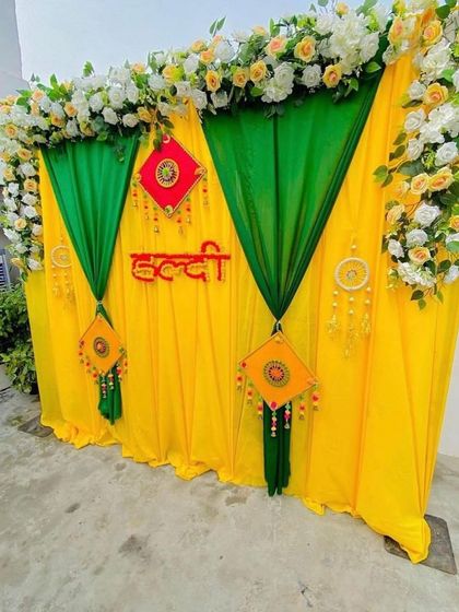 We create bright and festive backdrops perfect for your Haldi ceremony. Our designs feature traditional elements like marigold flowers and phulkari umbrellas, combined with colorful drapes and seating arrangements to make your photos pop.