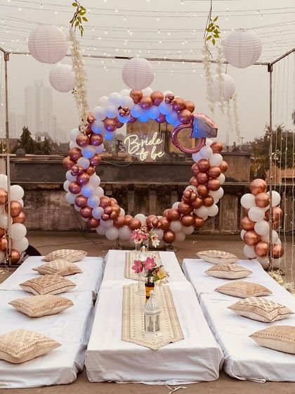 We design Instagram-worthy setups for your bride-to-be or bachelorette party. Choose from modern ring backdrops, elegant arched panels with custom neon signs, or complete terrace canopy decorations with low seating.
