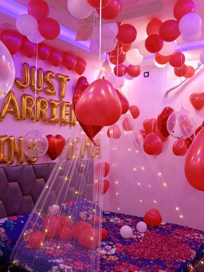 Surprise your partner with a beautifully decorated room for your first night or anniversary. We create a romantic atmosphere using fairy lights, balloon canopies, rose petals, and "Just Married" foil balloons.