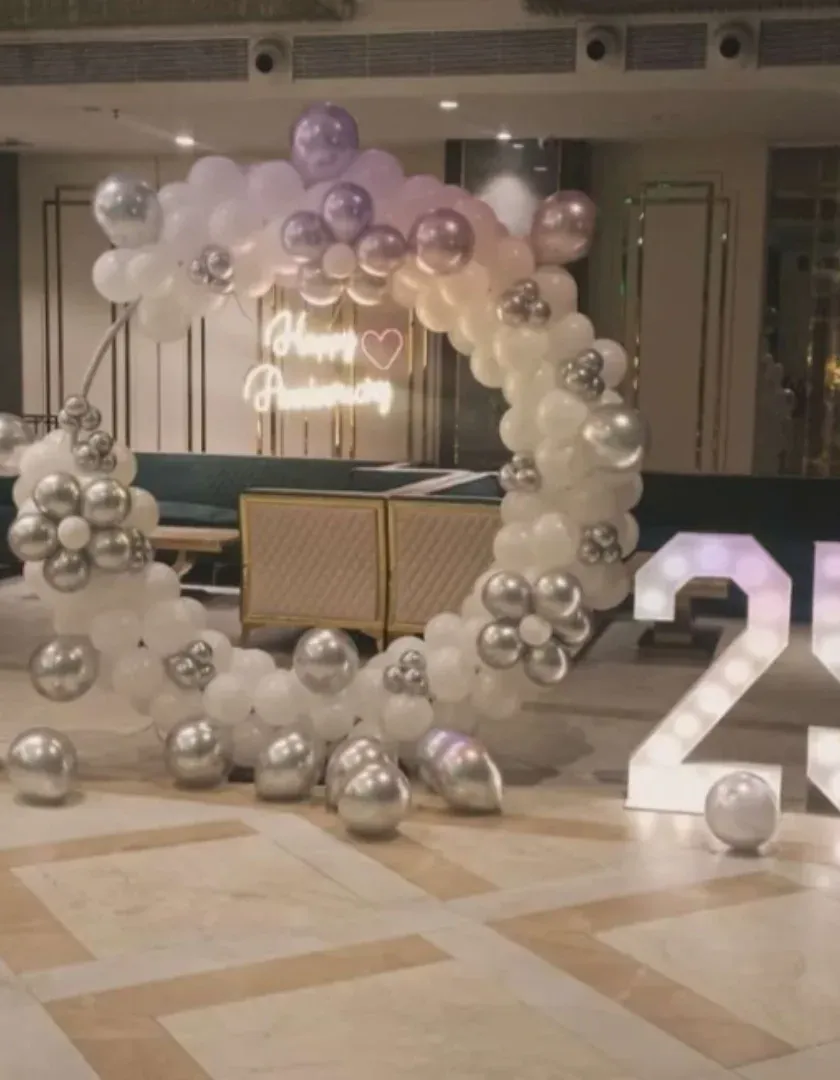 Make your anniversary unforgettable with my custom decoration services. I design setups for all milestones, featuring balloon arches, marquee numbers, neon signs, and romantic room decor to create the perfect atmosphere for your celebration.