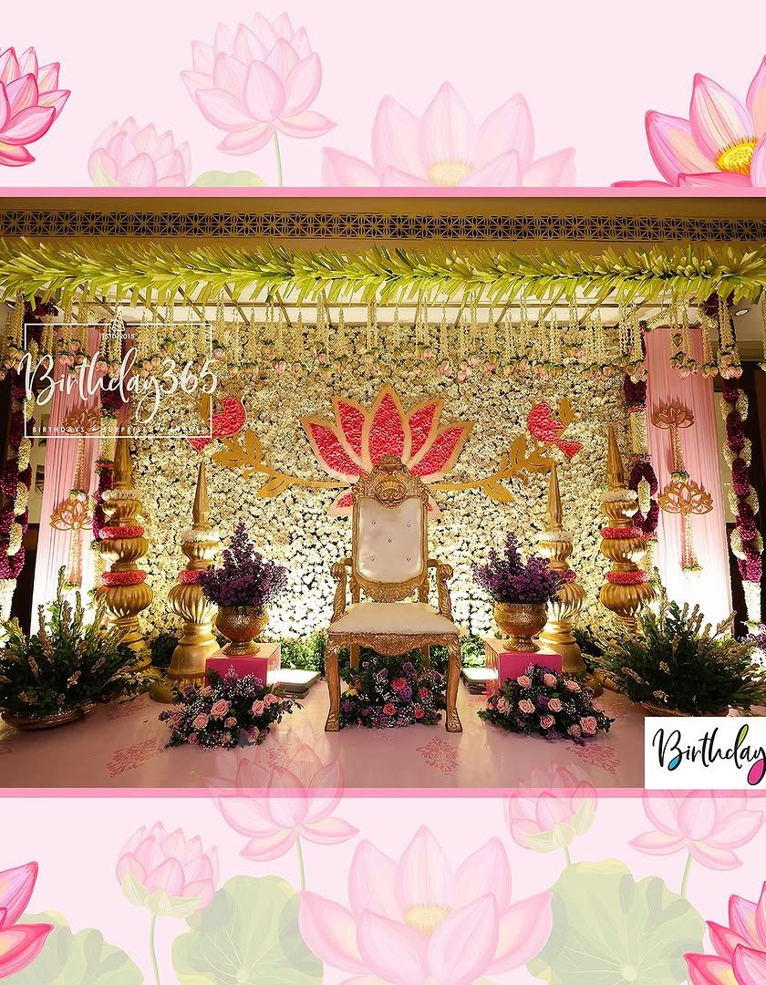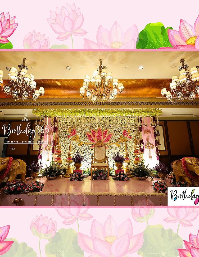 I specialize in creating grand, royal settings for coming-of-age ceremonies. These setups feature signature elements like pink and gold lotus themes, ornate stages with floral backdrops, golden elephant statues, and regal seating to make the day truly memorable.