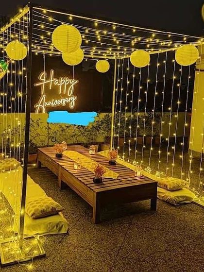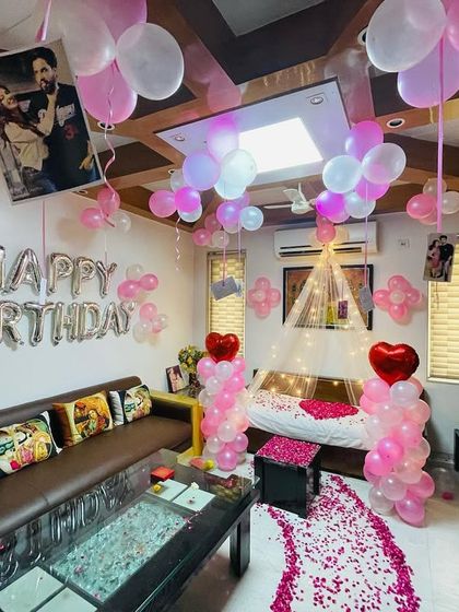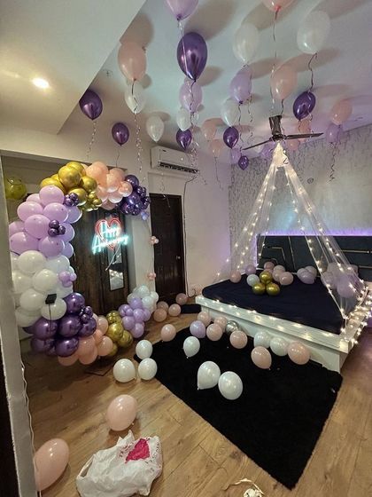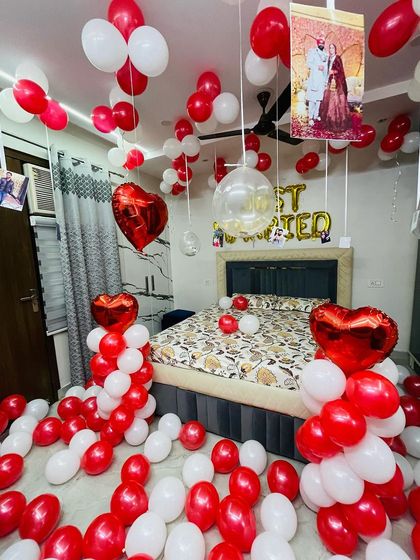 We set up romantic balloon and light decorations at your home for anniversaries, first nights, or surprises, with same-day service in Delhi NCR and custom setups for any room size.