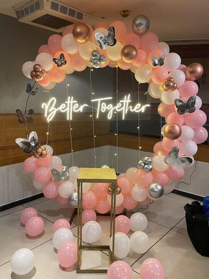 We set up bridal shower and bachelorette party decorations with ring frames, balloon garlands, neon signs, and custom themes, all done at your location in Delhi NCR with same-day setup.