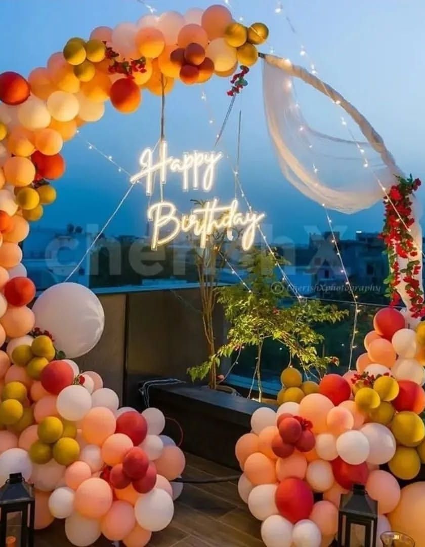 I can transform your terrace, balcony, or garden into a stunning party venue. My outdoor setups are designed to be sturdy and beautiful, using elements like large balloon arches, neon signs, and cozy tents with fairy lights. These decorations look especially magical during sunset and into the evening.