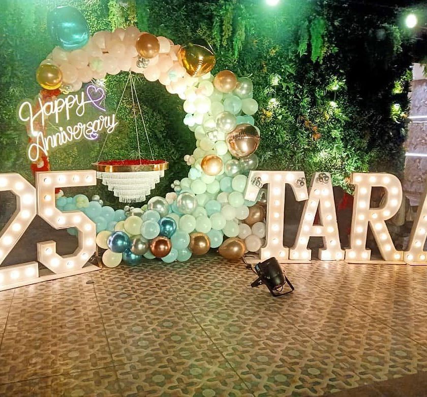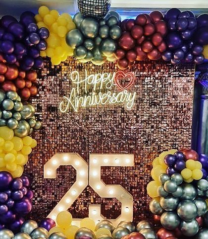 I create special setups for any anniversary, from your first year to your 25th. I can use classic red and white themes, elegant gold and white, or create a grand backdrop with marquee numbers for milestone celebrations.
