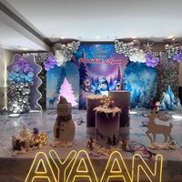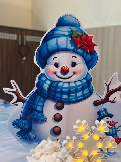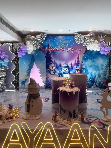 Beyond traditional Christmas, I design custom winter-themed decorations for birthdays and other events. These setups feature snow-themed backdrops, cool color palettes like purple, silver, and white, and charming details like snowman figures and reindeer props.
