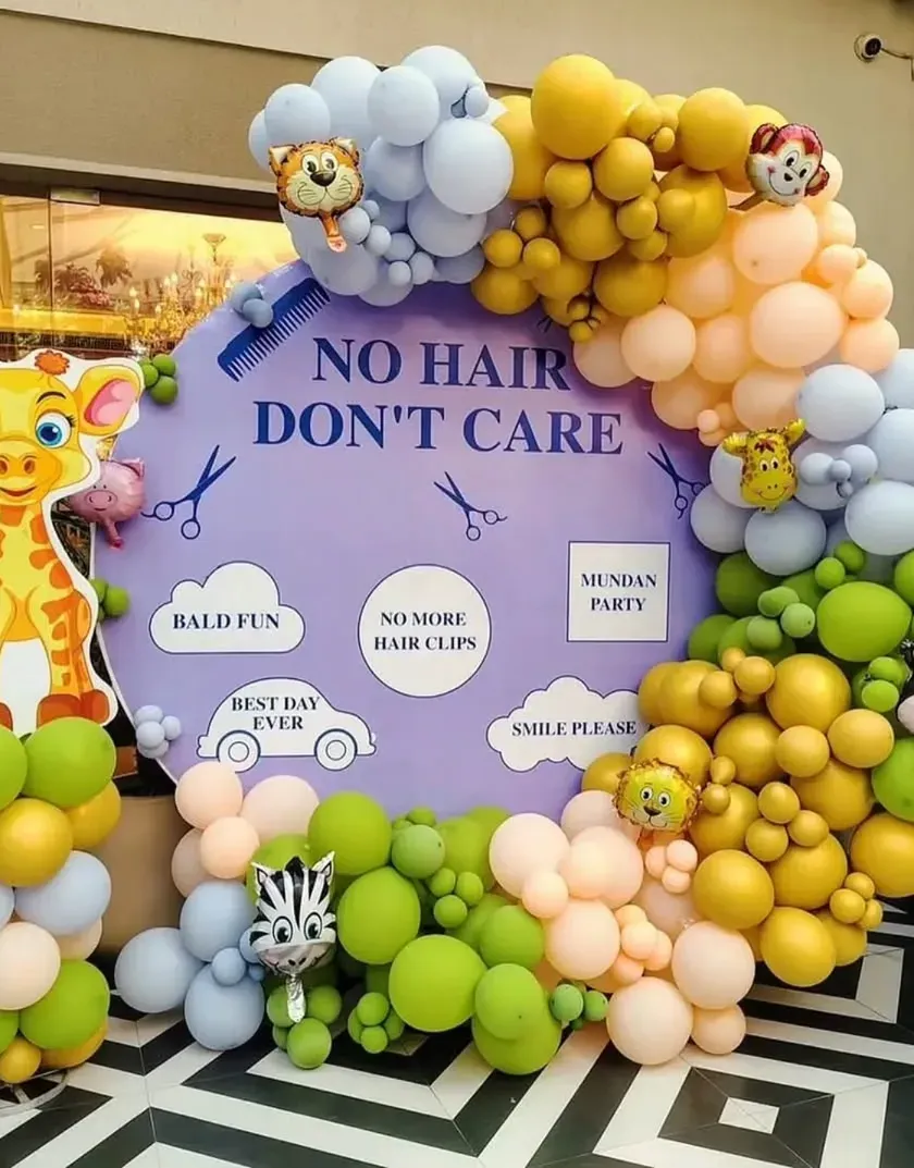 I create fun and memorable decor for your child's mundan or aqiqah ceremony. I can design playful backdrops with themes like "No Hair Don't Care" or elegant setups with custom signage for the special day.