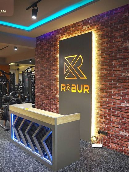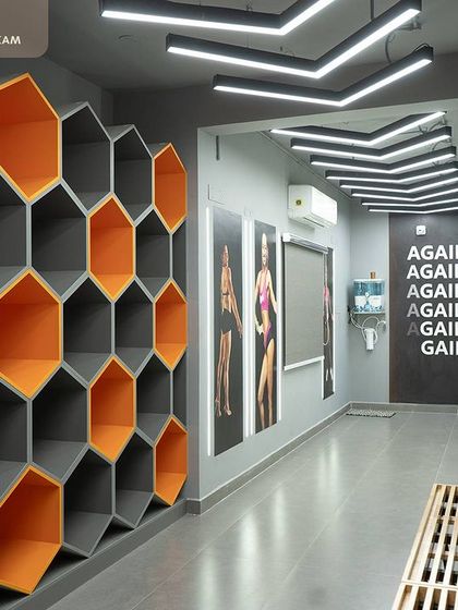 - For Robur Fitness Hub, we created custom gym interiors with lively lighting, bold graphics, and even a honeycomb-style shelf that doubled as storage and art.
