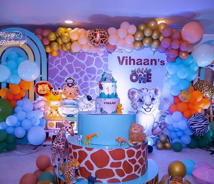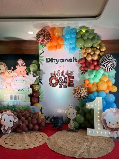 Perfect for "Wild One" first birthdays, I design exciting jungle and safari adventures. These setups feature animal cutouts, jeep props, themed balloon garlands with animal prints, and lush green elements to create a wild atmosphere.