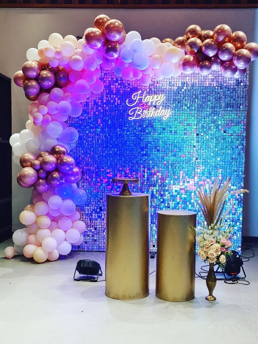 I also design stylish setups for adult birthdays, anniversaries, or any sophisticated celebration. This includes elegant sequin backdrops, modern floral arrangements, custom neon signs, and themed color palettes like rich purples or tropical brights.