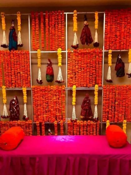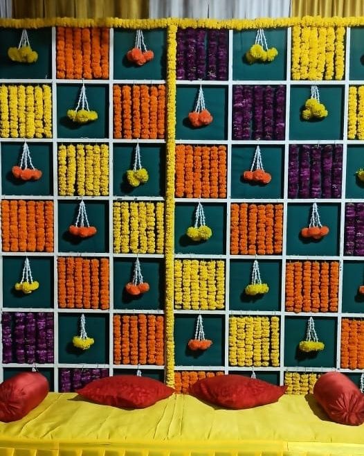 These pre-wedding functions are all about color and fun, and the decor should reflect that. I specialize in creating lively backdrops using traditional elements like marigolds, puppets, and bright drapes, perfect for photos and celebrations.