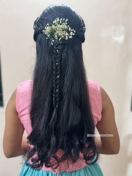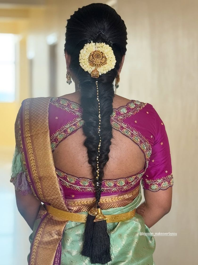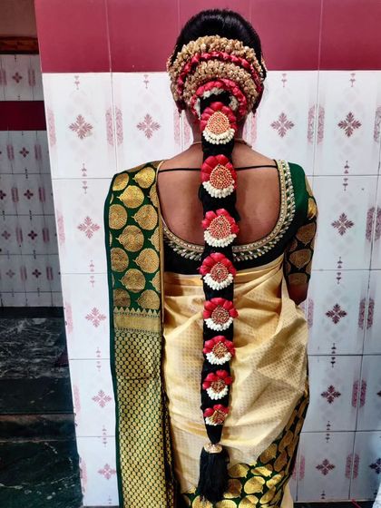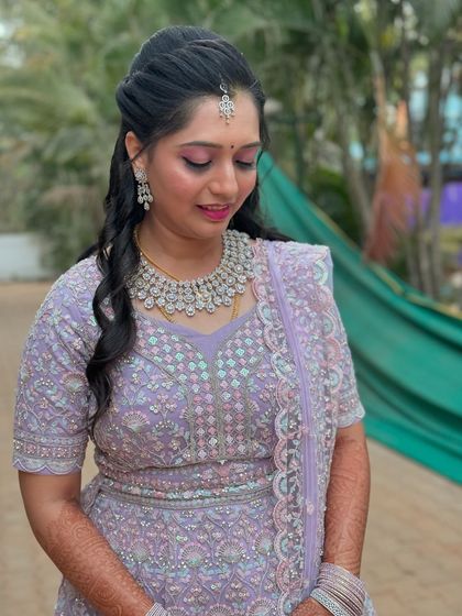 A perfect hairstyle completes your look. I offer a wide range of hairstyling services, from traditional floral braids and elegant buns for muhurthams to modern soft curls and messy updos for receptions. I also style hair for guests and family, ensuring everyone looks their best.