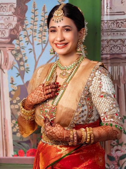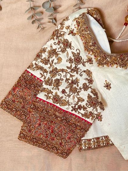 We create complete bridal ensembles that harmoniously blend our signature blouses with complementary sarees and accessories. Each ensemble features intricate handcrafted embroidery using traditional techniques like zardosi, aari work, and beadwork.