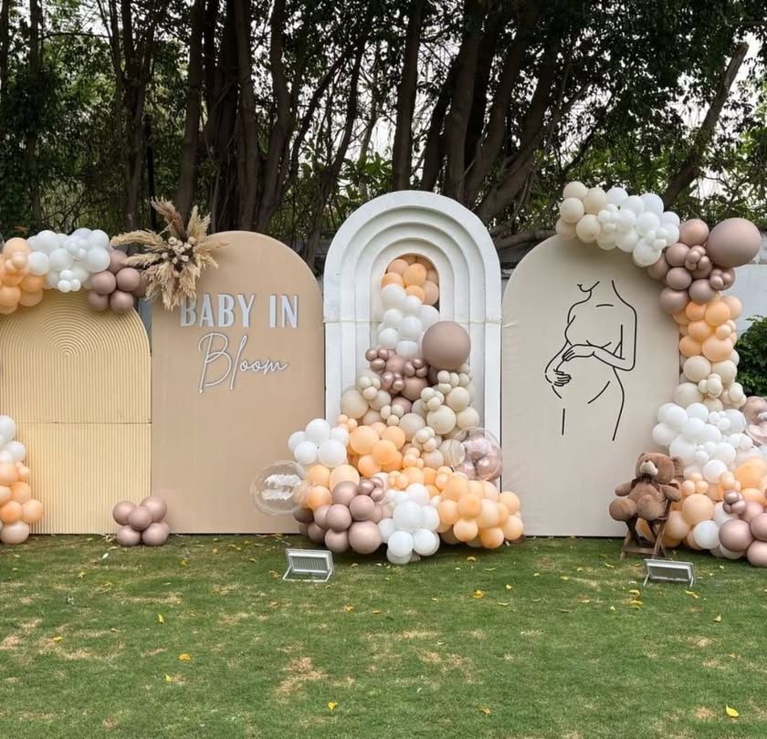 For a sophisticated celebration, I design setups with modern aesthetics like arched backdrops, pampas grass, and elegant color palettes. This includes popular "Baby in Bloom" floral designs, butterfly motifs, and chic boho styles perfect for a trendy mom-to-be.