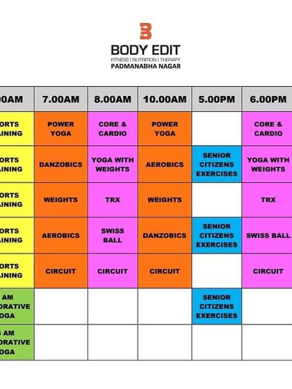 Find the perfect class to fit your lifestyle. We offer a wide variety of sessions from early morning to evening, including Yoga, Zumba, TRX, and specialized senior citizen classes at our Padmanabhanagar studio.