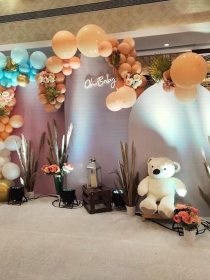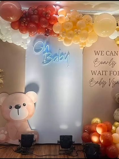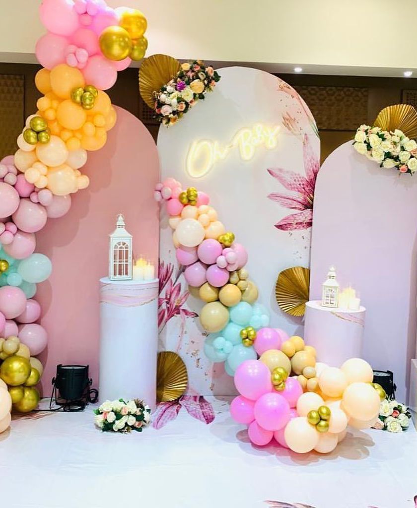 We design chic and modern baby shower backdrops featuring the popular "Oh Baby" neon sign. These setups often use arched panels, multi-colored pastel balloon arrangements, and props like plinths for cakes or floral accents.
