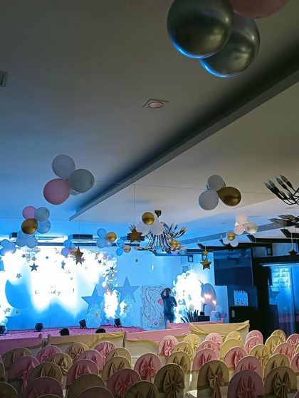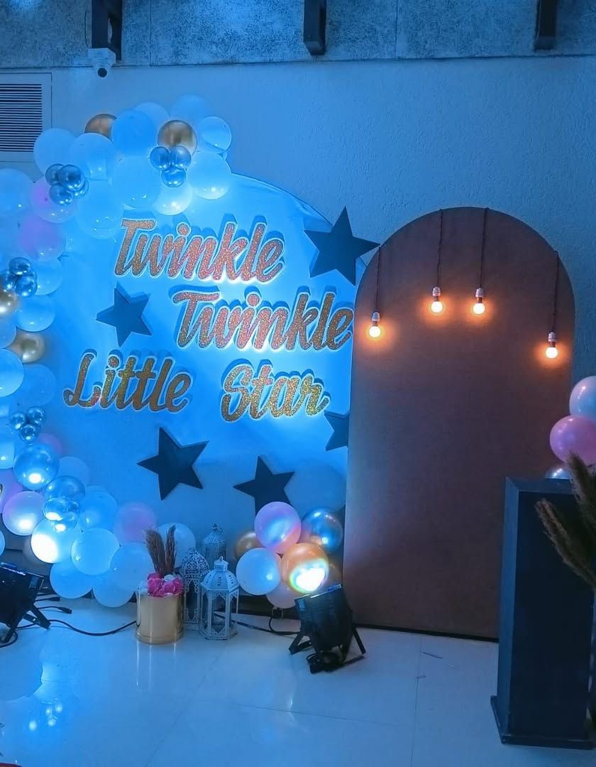 We create a magical, dreamy atmosphere with our "Twinkle Twinkle Little Star" theme. This setup is perfect for both baby showers and welcome home parties, using moon and star props, cloud-like balloon decor, and dramatic lighting to bring the night sky indoors.