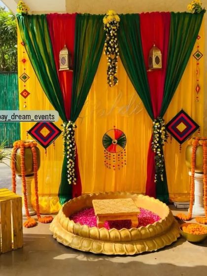 - Diwali party setup with traditional motifs, fairy lights, and flowers.