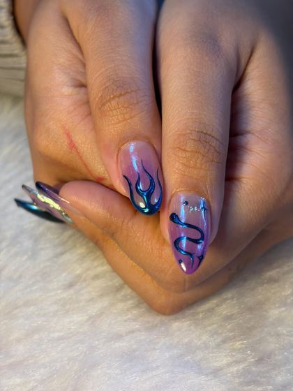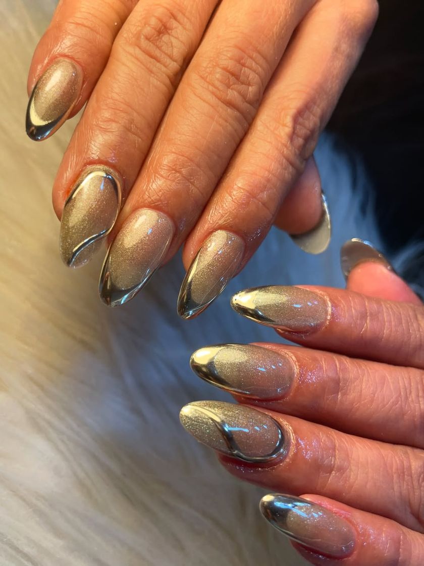 We love experimenting with the latest trends, and our chrome, cat-eye, and metallic finishes are always in high demand. From a subtle pearly sheen to a bold liquid metal look, we use high-quality powders and polishes to achieve that perfect, reflective shine.