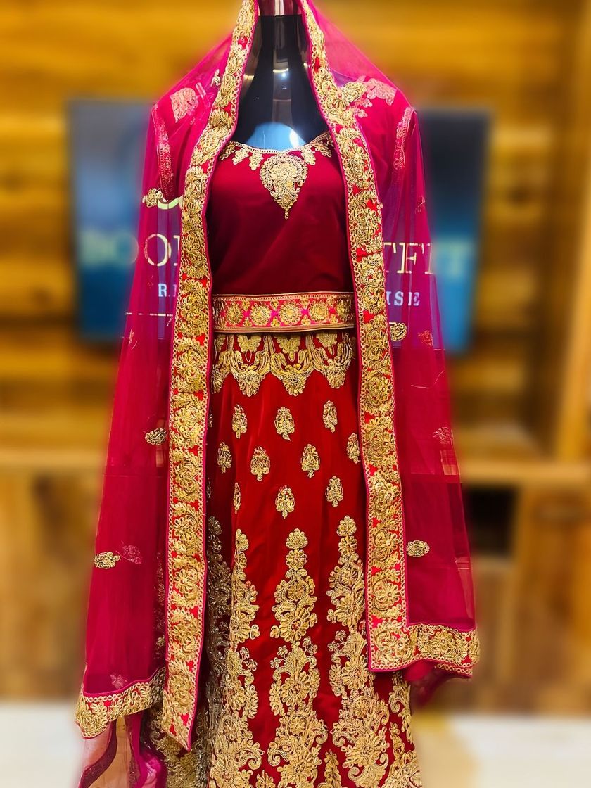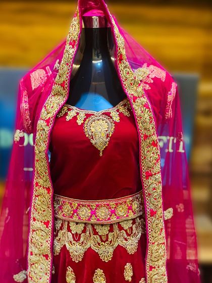 I offer a collection of stunning bridal lehengas, perfect for your wedding day. You'll find classic red velvet sets with intricate gold embroidery, as well as modern, heavily embellished options for a grand reception.
