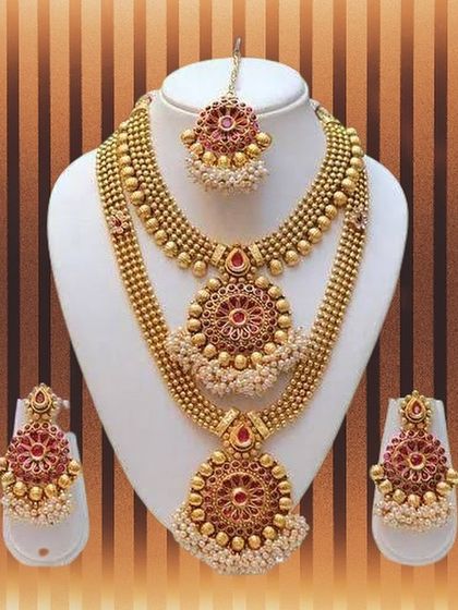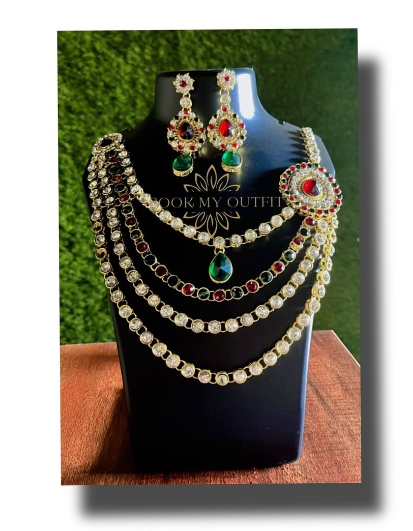 I provide grand, complete jewelry sets for brides and wedding guests. My collection includes everything from heavy, layered necklaces and chokers to matching earrings and maang tikkas, available in both traditional gold-toned designs and modern white-stone styles for receptions.